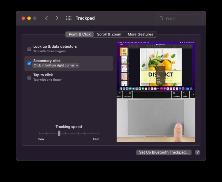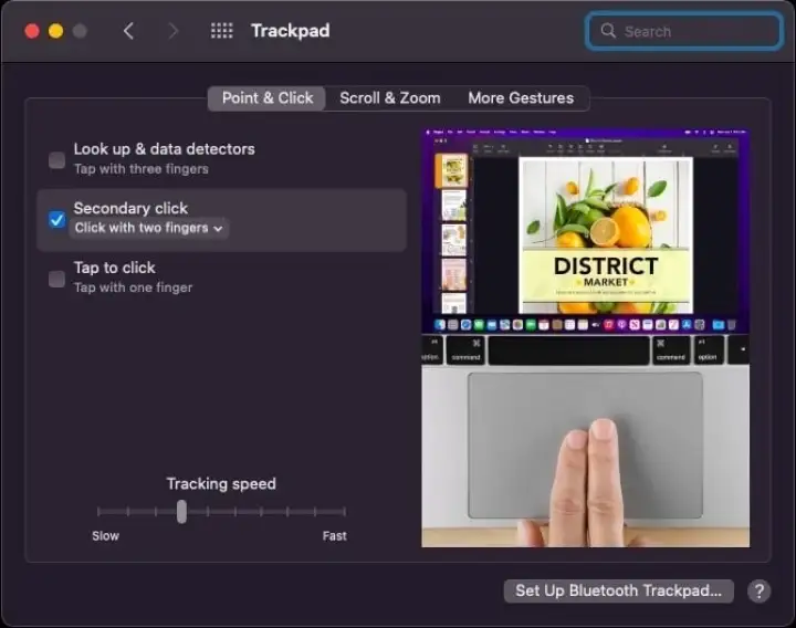 如果你不喜欢两个手指点击选项,你可以将触控板的一角设置为指定的右击按钮。在系统首选项>触摸板下进行设置,方法是按下二次单击的下拉菜单,然后选择在右下角单击或在左下角单击。现在,你只需点击你选择的触控板的一角,右击菜单就会出现,而不是使用Ctrl键或使用两个手指。