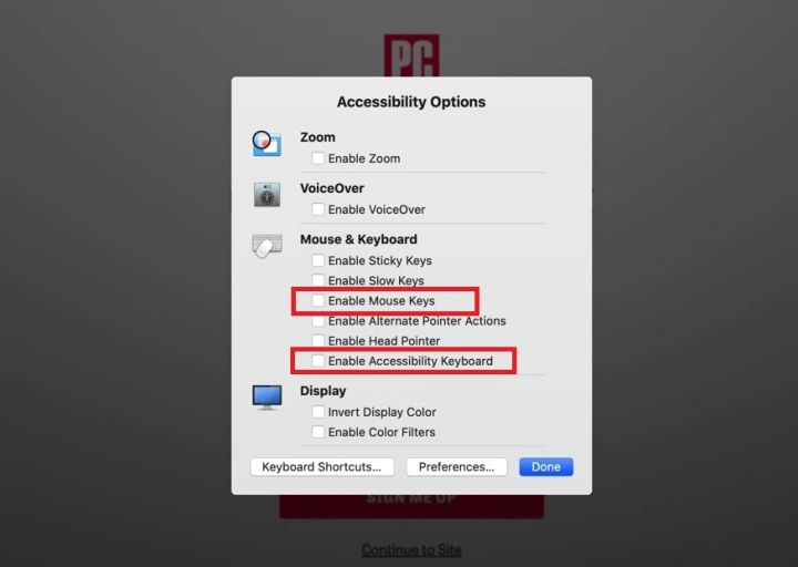 对于需要更易访问的选项的用户,请按Option+Command+F5打开辅助功能选项菜单。您可以单击启用鼠标键,然后使用Function+Control+I快捷键打开当前所选程序的右击菜单。