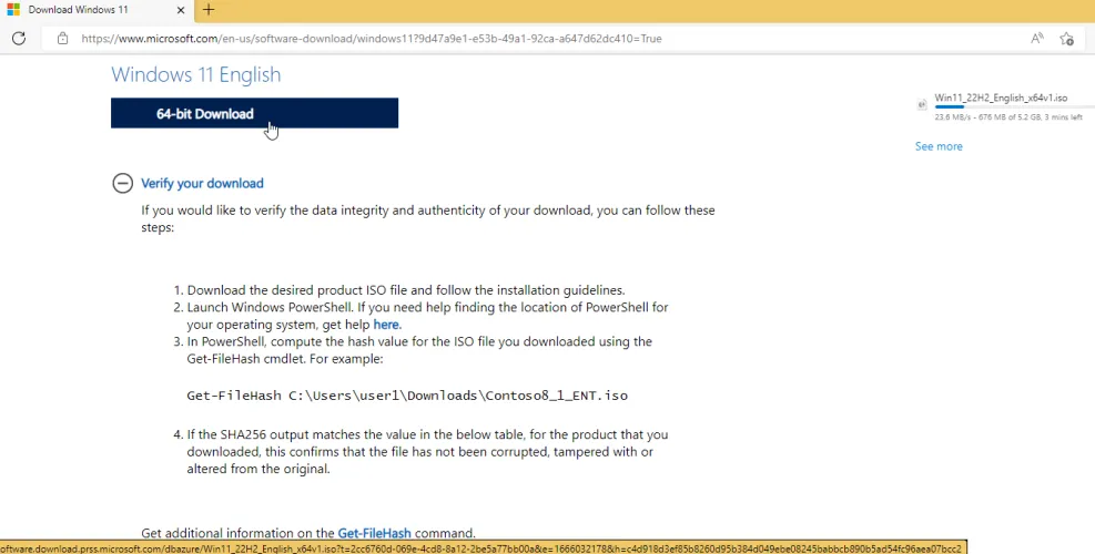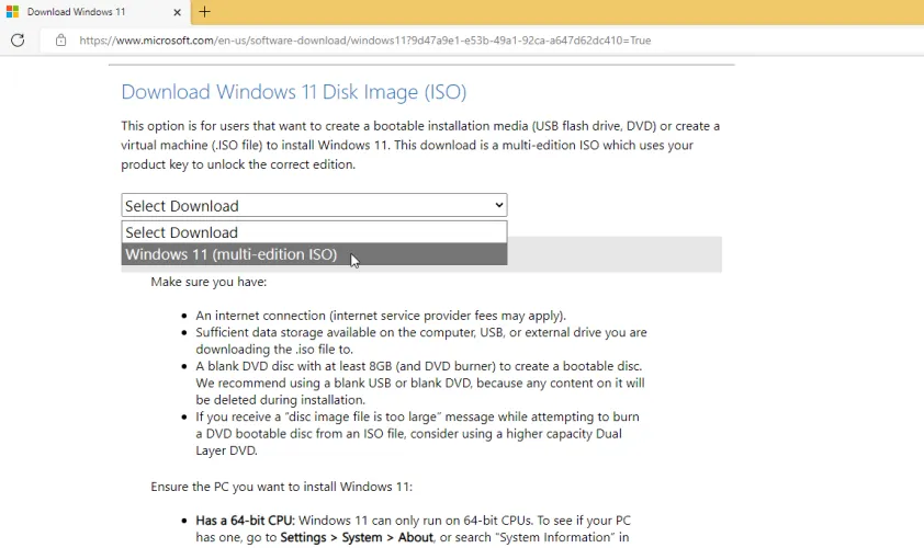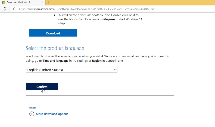 向下滚动屏幕并单击下载,打开产品语言下拉菜单,选择您的语言,然后单击确认。接下来,单击64位下载以获取ISO文件。