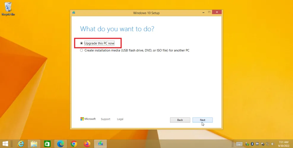 在询问您要做什么的屏幕上,选择立即升级这台电脑,然后单击下一步。然后窗口10下载开始。确保你想要安装的Windows 10版本与Windows 8.1的版本相匹配(例如,家庭版与专业版),然后接受许可条款。
