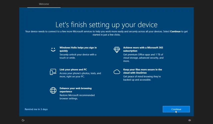 可能会出现一个屏幕,要求您完成设备设置。单击继续,然后按照任何后续屏幕操作。然后,您应该进入新的Windows 10环境。