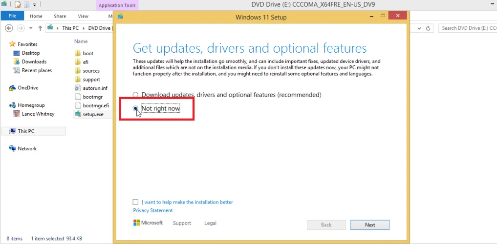 在安装Windows 11窗口中,单击更改安装程序下载更新的方式链接,然后选择非立即选项并单击下一步。然后,如果您的PC不符合Windows 11的安装条件,系统会提示您它缺少TPM 2.0和/或Secure Boot。