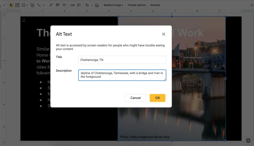 在分发会议材料之前(现在您将在会议之前这样做),请确保为所有重要图像添加ALT文本。Alt Text允许无法看到图像的人,无论是因为残疾还是技术问题,都可以获得他们丢失的内容的简要描述。例如,如果您包括财务图表,则Alt文本应简要总结您试图突出显示的内容,例如“图表显示2022年1月至6月50%的增长”。