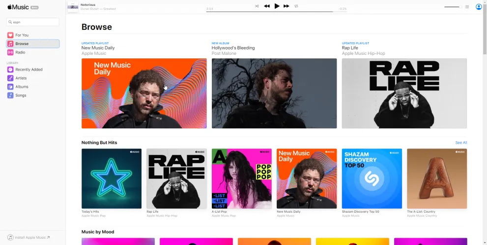 浏览部分主要在每周五发布新歌和专辑时刷新。顶级宣传图片通常与时事(如死亡、假期或重大事件)或流行艺术家和新创建的播放列表捆绑在一起。