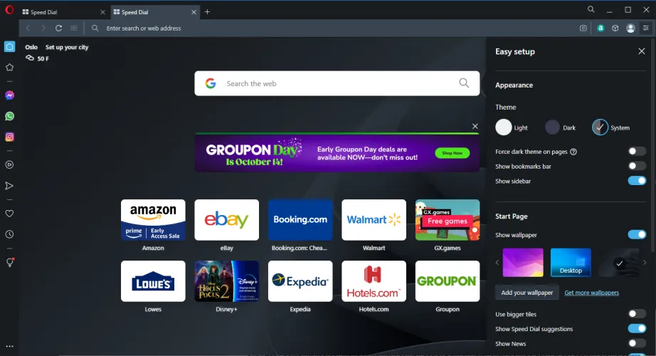 对于标准的Opera浏览器,打开右上角的Easy Setup Hamburger菜单,然后选择Dark或System以更改颜色。您还可以启用强制页面变暗主题,以使用可将网页变暗的实验工具。