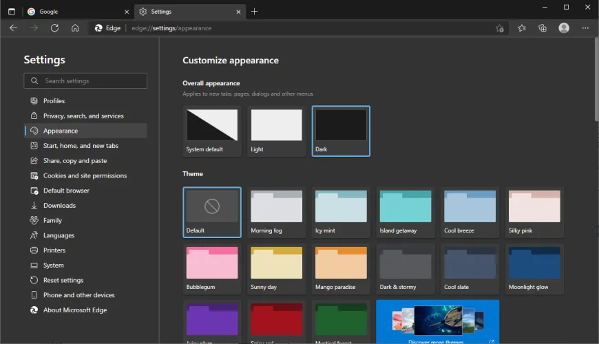 微软的Edge基于谷歌的Chromium浏览器,但与Chrome不同的是,它实际上有一个内置的黑暗模式。默认情况下使用系统主题,但也可以手动更改。打开三点菜单,进入设置>外观,然后选择整体外观下的深色。选择颜色主题以进一步自定义浏览器的顶部菜单栏。