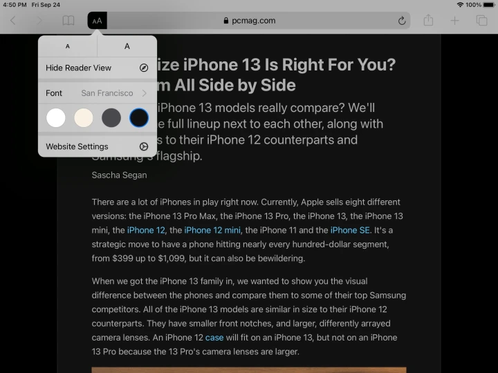 Safari的Reader View功能提供了一种针对单个页面的解决方案,该功能提供了文章的精简版本。要使用此功能,请打开您想要阅读的页面,然后在地址栏中选择AAA符号,并在下拉菜单中选择最深的色调。