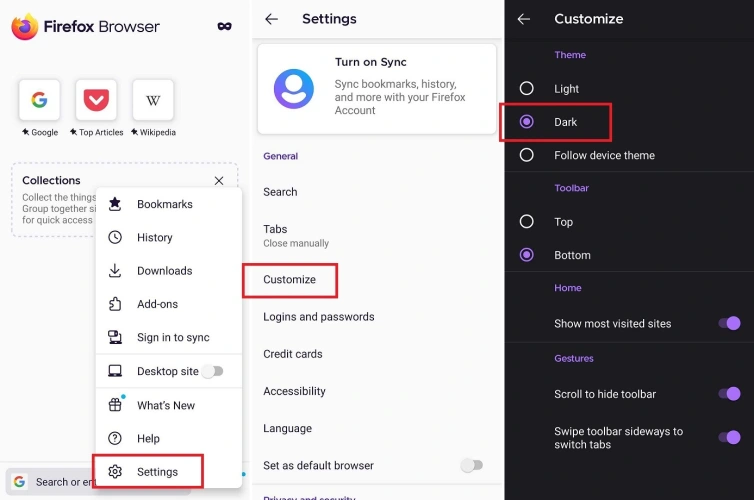 你可以在火狐安卓应用程序中设置主题,方法是打开三个点的菜单,然后进入设置>定制。在“主题”下,选择“黑暗”或“跟随设备主题”。对于iPhone或iPad,在应用程序中选择汉堡菜单,然后点击打开夜间模式。