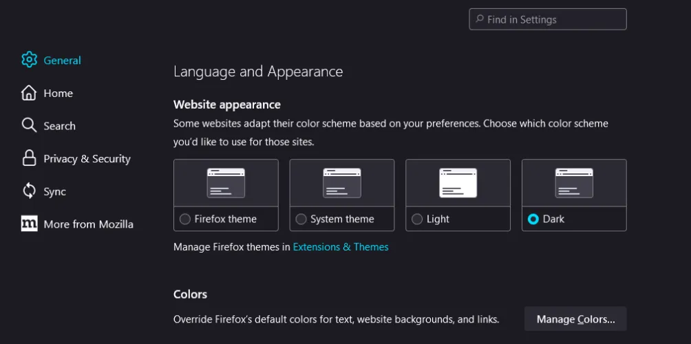 Firefox也有一些选项,可以告诉受支持的网页根据您的设置更改配色方案。在“设置”>“常规”下,将网站外观设置为“深色”,然后查看哪些网站将在浏览器旁边使用黑色主题。您也可以单击管理颜色并尝试更改背景颜色。