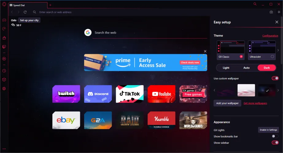 默认情况下,OPERA GX应启用暗模式。不过,您可以点击右上角的Easy Setup Hamburger菜单,然后选择Dark或Auto。单击配置链接以设置自定义主题颜色。