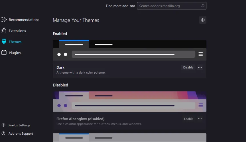 如果你打开浏览器的汉堡包菜单并选择设置>扩展和主题,Firefox允许你添加主题。单击主题以打开管理您的主题页面,然后选择要使用的主题,如黑暗。如果您单击页面底部的查找更多主题,则可以找到其他主题。