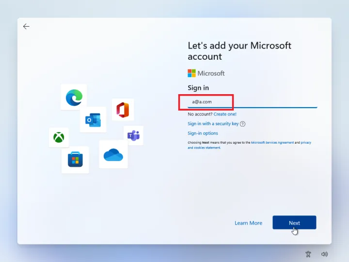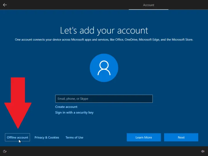 在设置过程中,当系统询问您希望如何设置设备时,请选择设置为个人使用。单击下一步,然后单击登录按钮。当要求添加您的Microsoft帐户时,请键入以下虚拟帐户名:[电子邮件受保护],然后单击下一步并添加密码(可以是任何您想要的密码)。