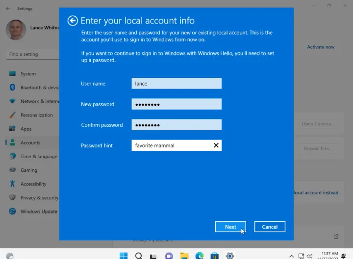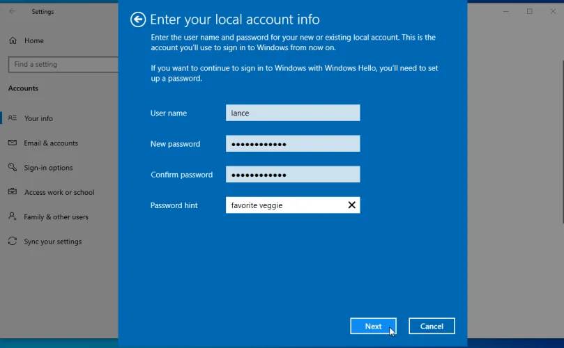 Windows询问您是否确实要使用本地帐户登录。单击下一步,然后输入用于登录Windows的PIN或密码。然后,您可以为本地帐户创建用户名和密码。确认密码并键入密码提示,然后单击下一步。