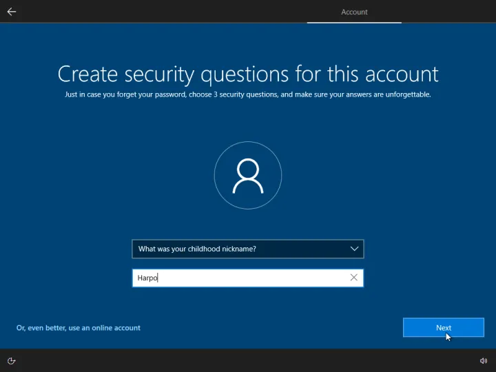 点击下一步,你会被告知出了问题。再次单击下一步,您将进入另一个屏幕,您可以在其中设置本地帐户。若要继续,请输入要用于该帐户的名称和密码,然后为该帐户设置三个安全问题。