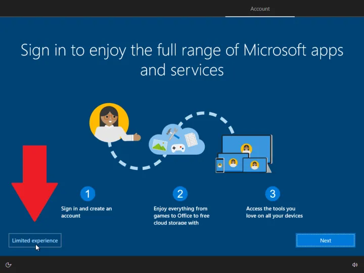 下一个屏幕要求您输入您的Microsoft帐户的电子邮件地址或电话号码。相反,请单击脱机帐户链接(这是微软对本地帐户的说法)。Microsoft会尽最大努力引导您远离本地帐户,但如果您单击有限体验选项,则可以继续。