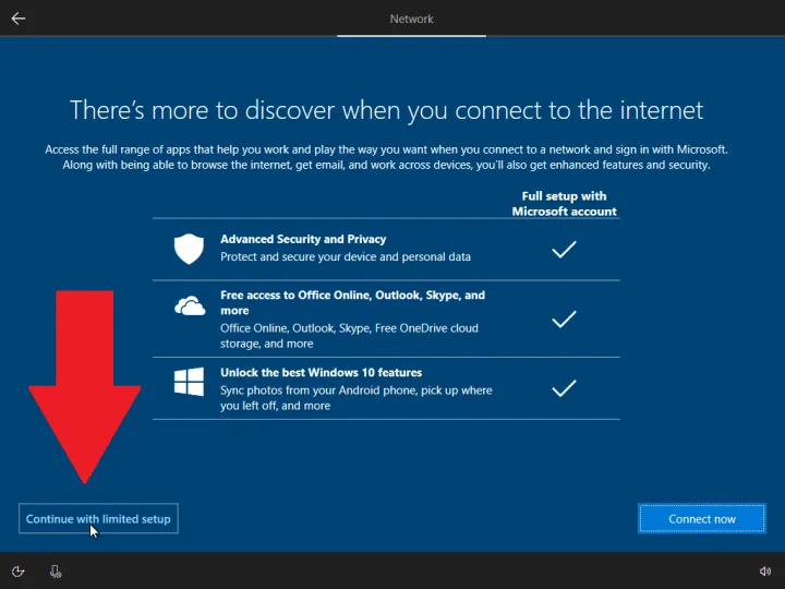 微软将试图说服你连接到互联网(并使用微软帐户)。单击使用受限设置继续选项以设置您的本地帐户。然后,您应该能够为您的本地帐户创建用户名和密码。