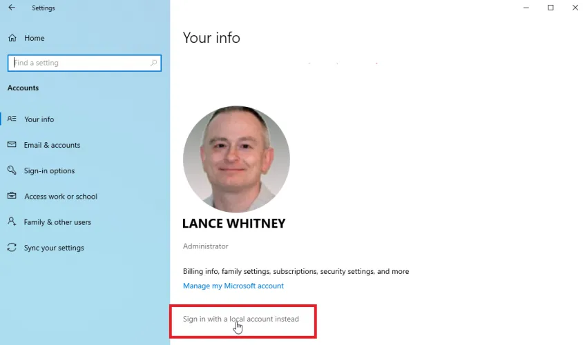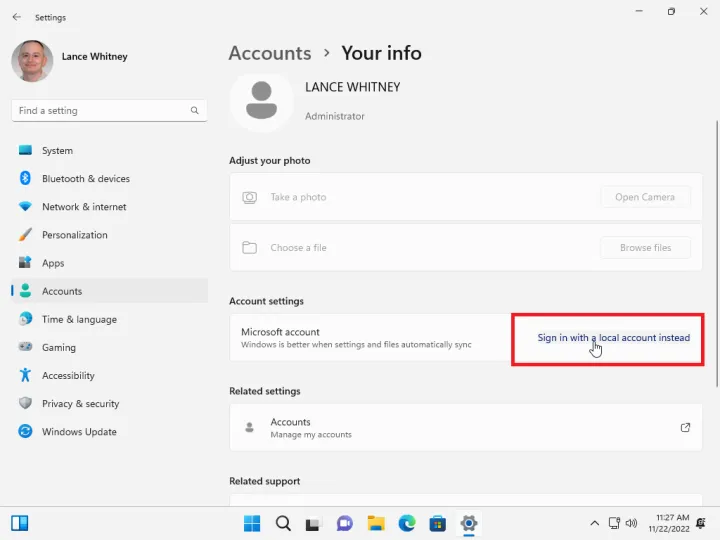 如果您使用的是Windows 11,请转到帐户>您的信息,然后点击使用本地帐户登录链接。在询问您是否确定要使用本地帐户的屏幕上,单击Next。输入您的PIN或密码以确认决定。
