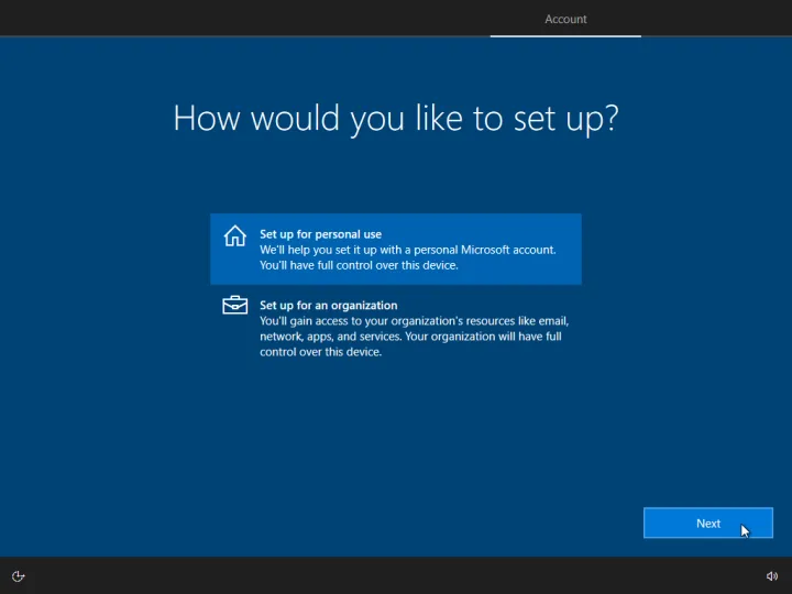 如果你有Windows 10专业版,设置本地账户要容易得多。在设置过程中,您将看到一个屏幕,其中提供两个选项:设置为个人使用和设置为组织。假设这是一台个人计算机,而不是一台工作PC,请选择设置为个人使用。