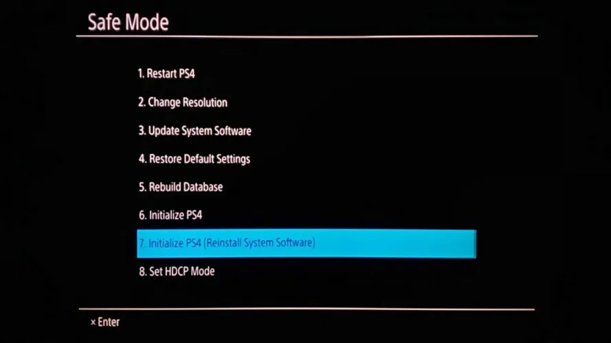 弹出闪存驱动器,然后返回PS4。您需要用USB数据线插入控制器,然后按住电源按钮,直到听到第二声嘟嘟声(大约7秒)。这将使您进入安全模式。选择初始化PS4(重新安装系统软件)选项,然后按X键。