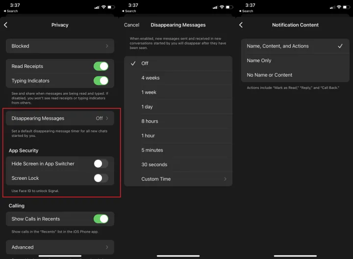 如果你真的需要保守假期计划的秘密,考虑一下安全的即时通讯应用。我们的首选之一是Signal。如果你将聊天限制在手机上(而不是桌面应用程序),你就可以锁定应用程序(设置>隐私>应用安全),所以只有你才能进入。您还可以打开消失的消息,以便聊天在设置的时间段后自动删除。Signal还可以模糊通知中的消息内容。