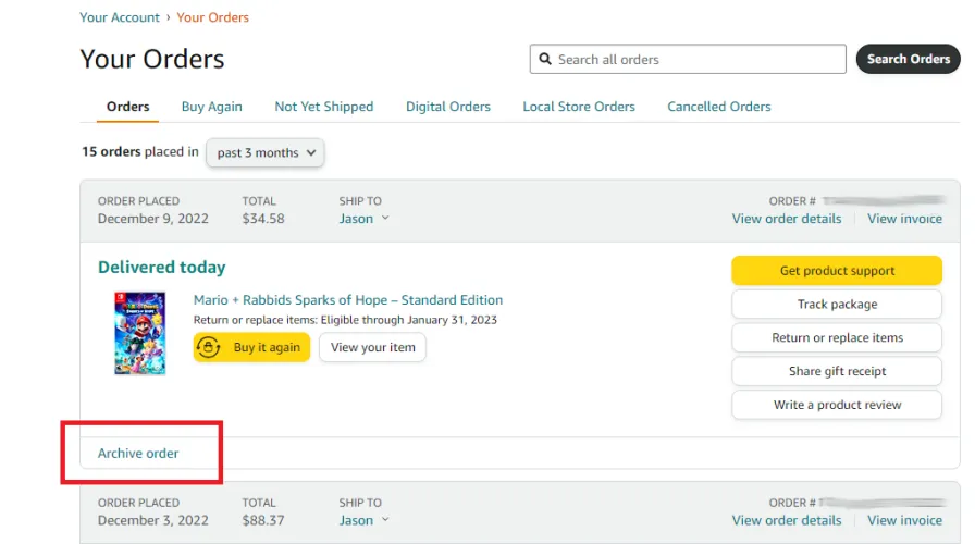 在亚马逊上,你可以对过去的购买进行存档,这样它们就不会立即显示在订单历史记录页面上。要做到这一点,你应该使用亚马逊的网站,而不是手机应用。打开您的帐户页面,然后选择您的订单。点击有问题的购买的存档订单链接。