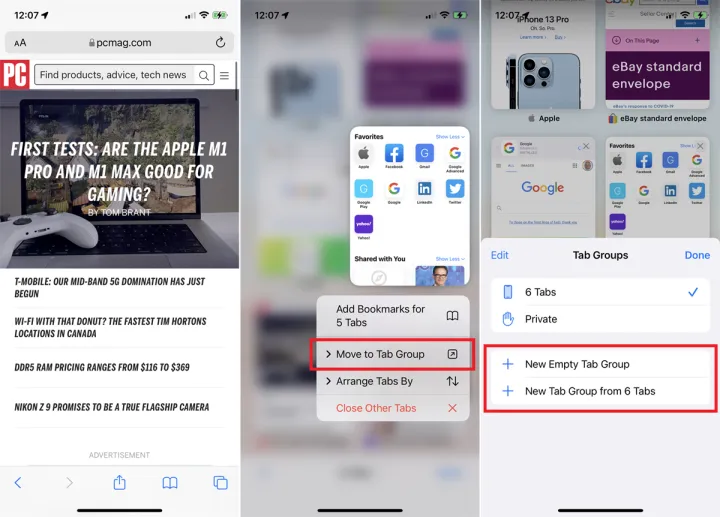 要在Safari移动应用程序中创建选项卡组,请点击右侧的选项卡图标,它看起来像两个重叠的正方形。在打开的网页上长按,然后选择移动到选项卡组。点击New Tab Group(新建选项卡组),并为该组命名。如果轻触选项卡图标,选择屏幕底部的向下箭头,然后从列表中选择您的组,则可以在选项卡组之间移动。