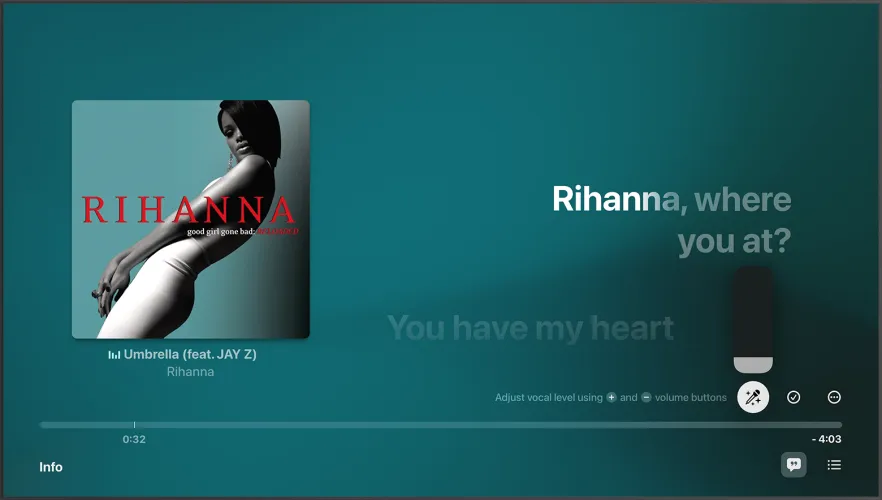 如果你计划在电视上使用卡拉OK功能,你将需要2022年底发布的Apple TV 4K,它运行的是最新版本的twOS。目前,Mac电脑或Android版Apple Music不支持Apple Music Sing。