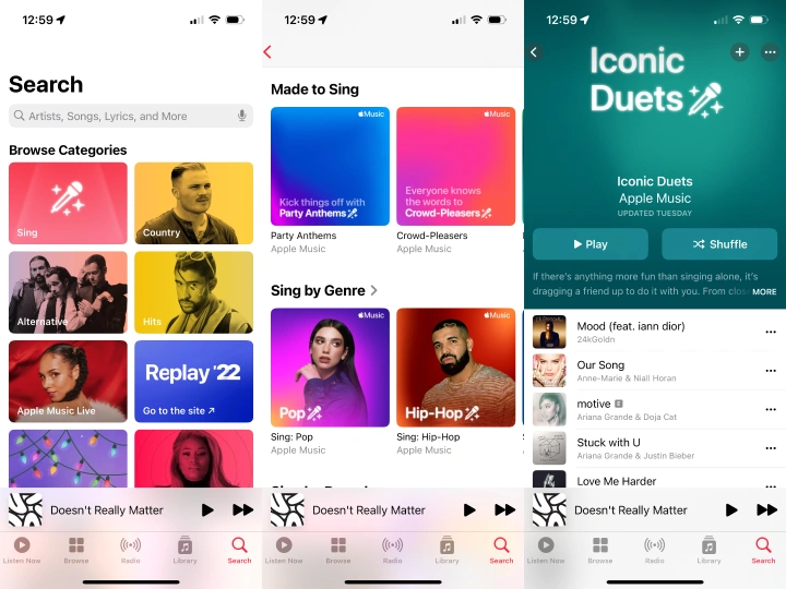 苹果表示,Sing功能一推出就有数百万首歌曲,50个专用伴奏播放列表也是如此。目前,可以在Apple Music的专用部分找到通过Sing支持卡拉OK的曲目。在iPhone上,点击应用程序底部的搜索图标,然后选择Sing Track的精选部分。在这个集合中,有更多精心策划的卡拉OK歌曲播放列表,如节日和二重唱。