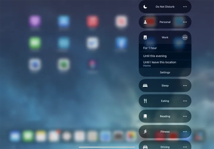 按住焦点图标,您可以访问任何不同的模式,如请勿打扰、工作、睡眠、吃饭和驾驶。轻触特定模式即可将其打开。点击任何模式的省略号图标,然后你可以决定是打开它一小时,直到今晚,还是直到你离开当前位置。