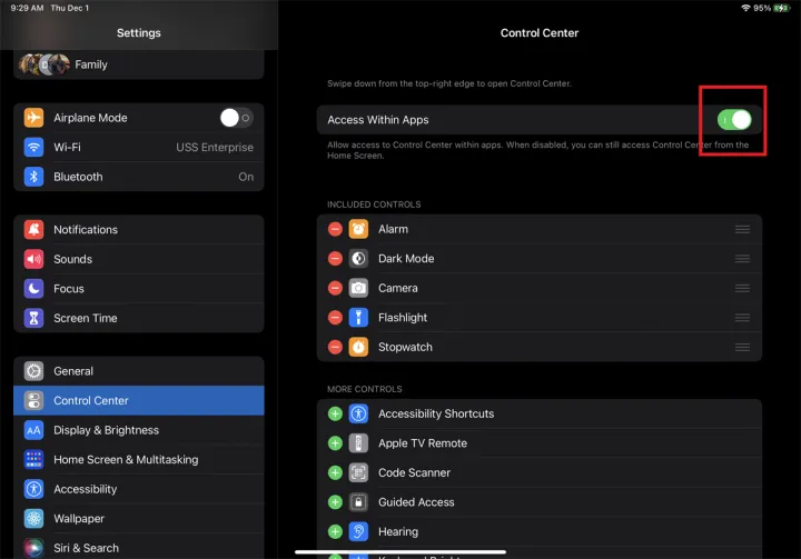 可以在设置>控制中心下自定义控制中心。如果你想在应用程序中使用控制中心,请确保启用了应用程序内的访问。
