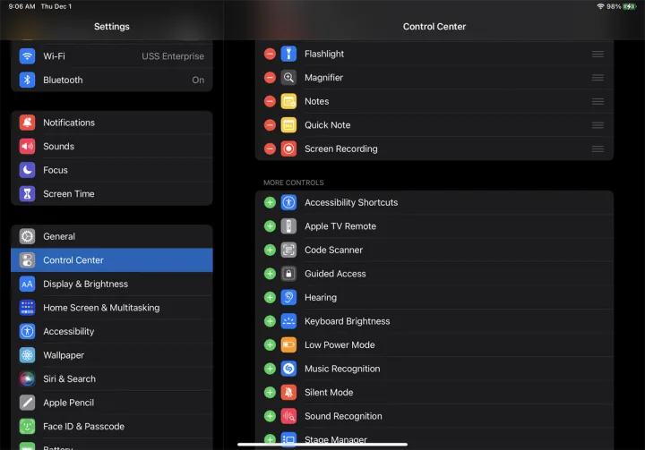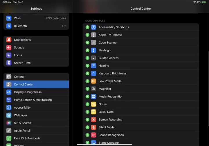 您可以添加的可选控件包括:辅助功能快捷键、闹钟、Apple TV遥控器、计算器、摄像头、黑暗模式、手电筒、引导访问、听力、键盘亮度、低功率模式、放大镜、音乐识别、便笺、快速笔记、二维码阅读器、屏幕录制、静音模式、声音识别、秒表、文字大小、计时器、语音备忘录和钱包。(请注意,其中一些选项仅对iPhone用户可用,如果您使用iPad,则不会显示。)