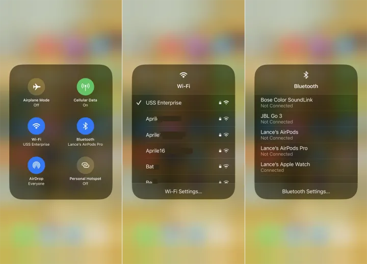 如果你按住飞行模式、AirDrop、Wi-Fi、蓝牙、蜂窝或个人热点,整个部分会变大,这样你就可以更容易地看到和控制它的任何选项。