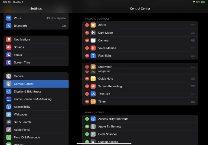 现在,您可以决定要从控制中心使用哪个控件。现有控件显示在“包括的控件”部分,而可用控件显示在“更多控件”部分。