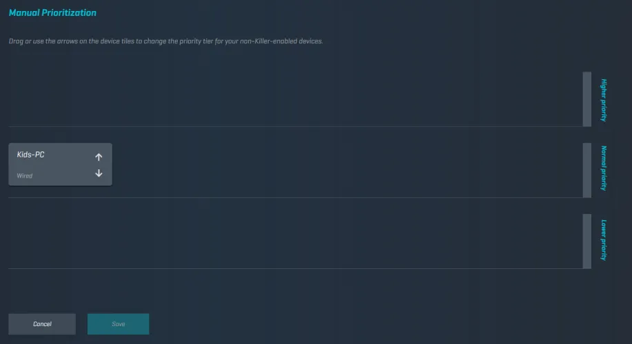 您还可以对网络上的设备设置优先级。几年前,这通常是通过提供设备的唯一MAC地址并为该设备设置优先级来实现的。如今,像Netkit这样的供应商越来越多地为相同的想法提供更直观、更图形化的方法,如下面的手册优先顺序和屏幕截图所示。
