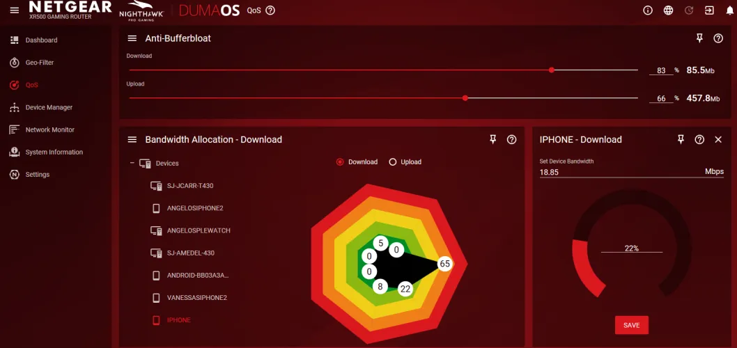 Qos选项还可以让您查看您的总带宽是如何按设备分配的,因此您可以发现任何人抢占的份额超过了他们的公平或期望份额。