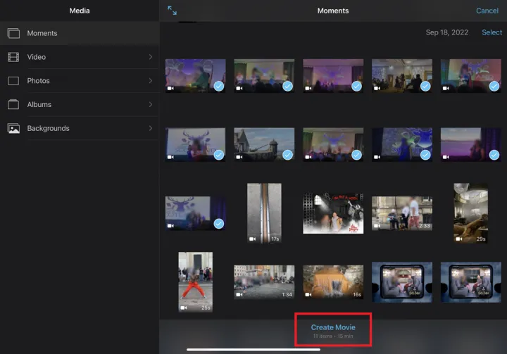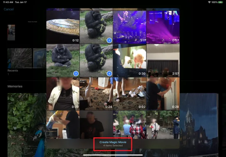 如果您选择Magic Movie,下一个屏幕将邀请您选择您的媒体。您可以从视频文件夹中选择一个或多个视频剪辑,或从建议的照片文件夹中选择一个或多个照片。浏览您的媒体并点击要包含的每个媒体。选择要添加的内容后,点击创建魔术电影。