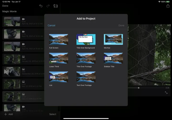 如果要添加带有标题的剪辑,请选择要使用的剪辑类型–例如全屏、背景上的标题、下三分之一或边栏–然后点击完成。键入您希望为您的视频提供的标题。点击Done(完成),然后点击Back(返回)返回上一个屏幕。