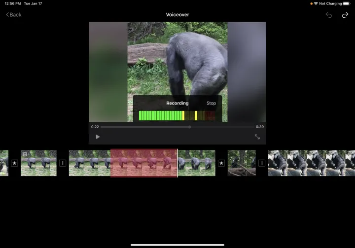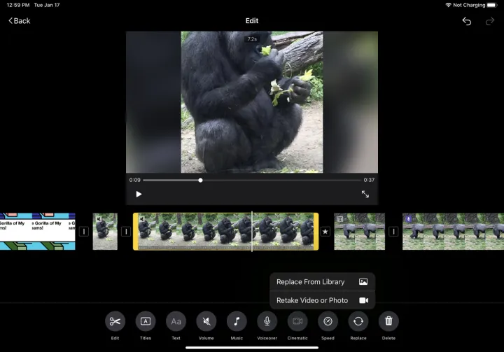 如果要更改某个部分,请点击替换,将其替换为您的媒体库或您拍摄的新视频中的不同剪辑。也可以按Delete键完全删除当前片段。在任何时候,您都可以点击右上角的撤消图标来取消上一次操作,或者点击重做图标来重复该操作。