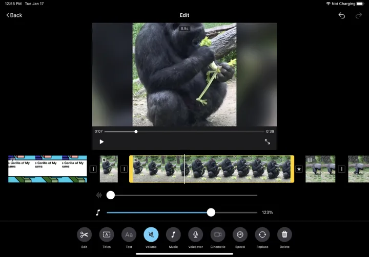 点击字幕可为当前剪辑添加字幕。点击文本以添加或更改当前剪辑的文本。点击音量调整剪辑的音乐或音频。点击音乐以添加或更改剪辑的音乐。点击画外音按钮,您可以录制所选剪辑的旁白。