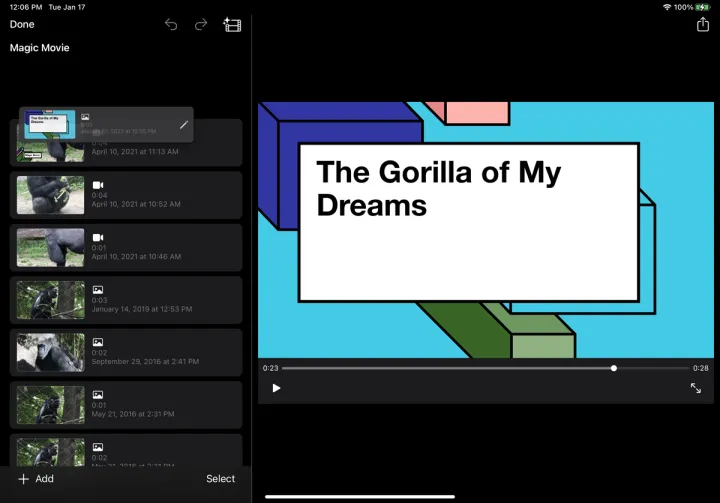回到视频的主屏幕,你现在可以玩这些剪辑了。在剪辑上向左滑动可将其从视频中删除。按住剪辑并向上或向下拖动可更改其在序列中的顺序。您可以点击选择,然后选择要删除或复制的多个剪辑。