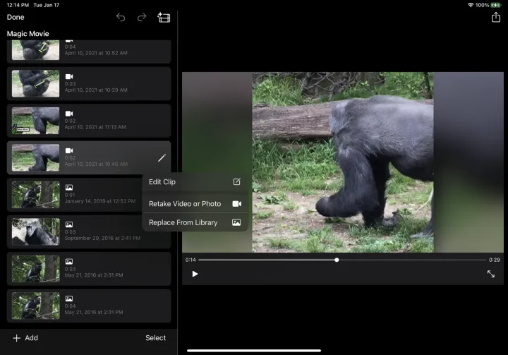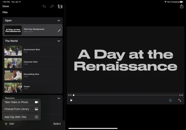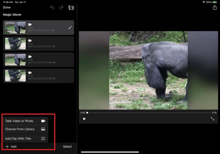 下一个屏幕显示您添加的每个剪辑或照片。点击左窗格底部的添加按钮,您可以从库中添加更多剪辑或照片,拍摄新视频或照片,或添加带有电影标题的剪辑。