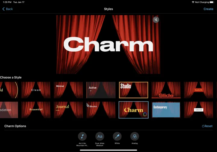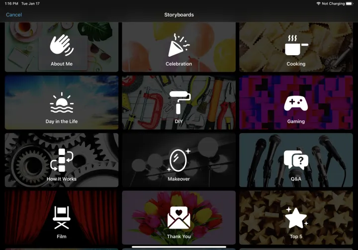 要改用预定义的情节提要制作视频,请从iMovie项目屏幕中选择情节提要。浏览情节提要缩略图,点击您感兴趣的缩略图。在下一个屏幕上,您可以更改样式、音乐、字体、颜色和滤镜。完成后,点击创建。