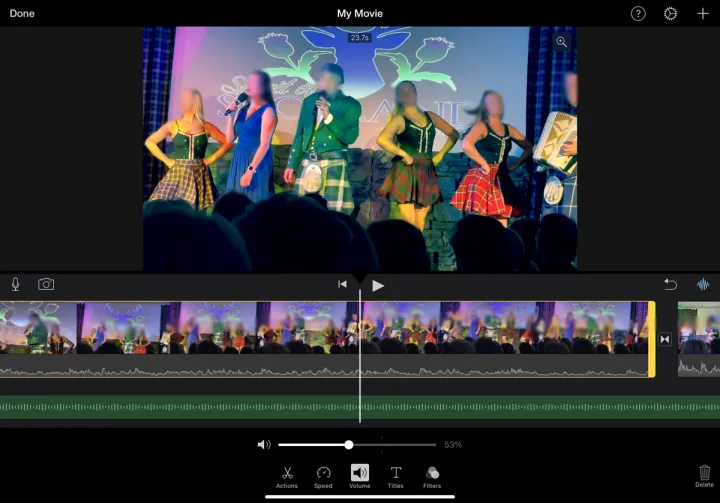 您可以轻触音量图标来提高或降低音量。选择字幕图标为当前剪辑创建字幕。轻触滤镜图标以将滤镜应用于剪辑。