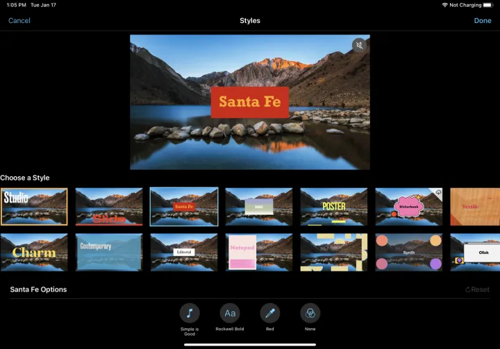 从屏幕底部的选项中,您可以选择不同的音轨、选择新的字体、更改标题的颜色以及添加滤镜。完成后,点击完成。您现在可以播放完成的视频了。