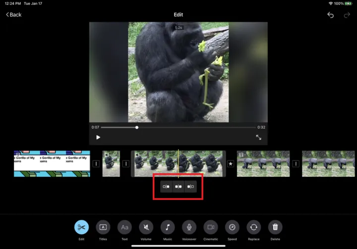 底部弹出一个工具栏,其中包含不同的命令。点击编辑以修剪当前剪辑。根据您在剪辑中放置标记的位置,最多将提供三个选项。使用这些选项可以删除标记左侧的剪辑部分、将剪辑一分为二或删除标记右侧的剪辑。