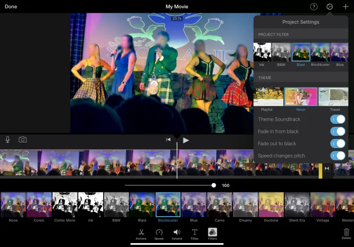 要进行进一步调整,请点击顶部的项目设置图标。从菜单中,您可以选择项目过滤器和主题,包括您选择的主题的配乐,淡入或淡出黑色,并改变音频的音调与任何速度的变化。