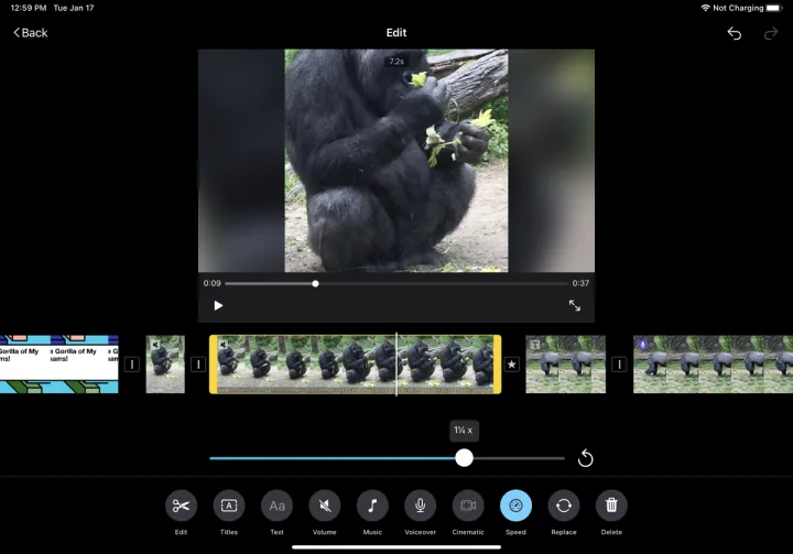 轻触时间线上的特定剪辑可调出屏幕底部的工具栏。您可以轻触动作图标以拆分剪辑、分离音频或复制剪辑。选择速度选项可调整当前剪辑的速度。