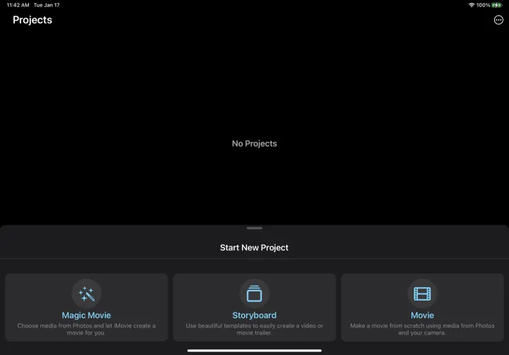 打开设备上的iMovie应用程序即可开始编辑过程。如果你在iPhone上使用它,你会发现更容易将设备保持在横向模式。点击开始新项目以查看您可以创建的三种类型的项目: