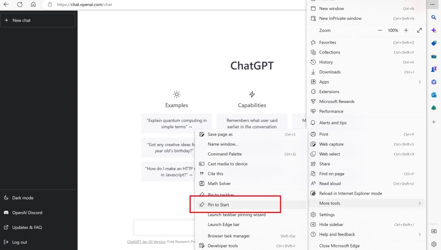 在这里,您需要进入省略号菜单(…)再次在右上角,然后向下滚动到更多工具>Pin开始。