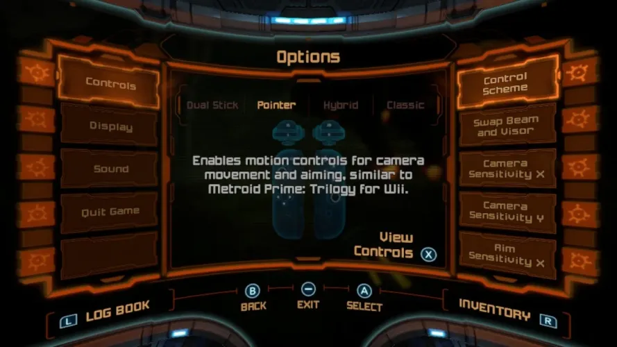 Dual Stick是最新的控制方案,也是默认的控制方案,也是我个人的最爱。为什么?它可以让你像玩传统的第一人称射击游戏一样玩Metroid Prime。你用左边的棍子移动,用右边的棍子瞄准,用扳机射击。你还有很多其他按钮来处理其他事情,比如扫描和变成变形球。它给人的感觉是敏捷、流畅和灵敏。此外,如果你计划在Switch的手持模式下体验Samus Aran的旅程,这几乎是唯一的玩法。